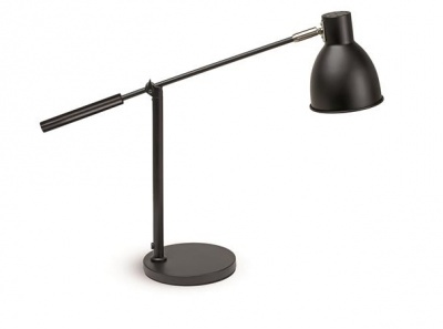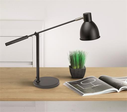 Stílusos matt fekete fém lámpatest, robusztus, acél karral. Elegáns munkahelyi megvilágítás, harmonikus irodai, otthoni vagy szállodai környezetet teremt.