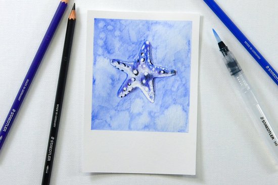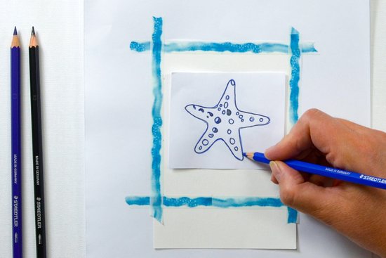 1. Töltsük le innen a tengericsillag mintát, és nyomtassuk ki. Árnyékoljuk a sablon hátulját a sötétkék akvarell ceruzával. Helyezzük a sablont (az előlappal felfelé) pontosan az akvarellpapír közepére. Az akvarellceruzával rajzoljuk le a körvonalakat és a vonalakat. Ezzel a motívumot átvisszük a papírra. Mielőtt eltávolítaná a sablont, ellenőrizze, hogy minden vonal átkerült-e.