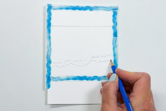 1. Rajzoljuk meg a horizont vonalát a felső harmadban. Az alsó harmadban rajzoljunk egy enyhén átlós kettős vonalat a hullámok fehér csúcsainak. Ez a vonal legyen görbe.