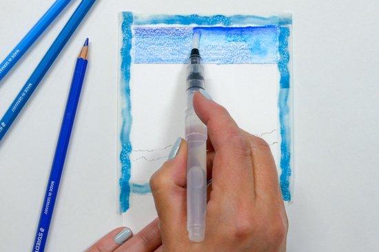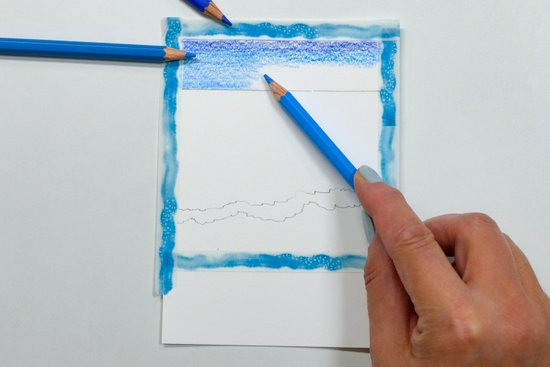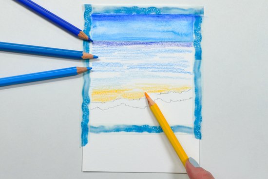 4. A permet fölött színezzük a vizet homokszínűre. Ezután váltsunk világos türkiz árnyalatra, majd a horizont felé a víz színét kék árnyalatokkal mélyítjük el. Hagyjunk vízszintes fehér foltokat, amelyek később a hullámok gerincét jelképezik majd.