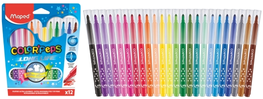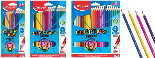 A dekoráláshoz tökéletes választás a MAPED „Color’ Peps Strong” termékcsalád háromszögletű színesceruza készlete. A hagyományos ceruzákhoz képest 37%-kal ellenállóbb, így biztosan nem törik ki a hegye színezés közben. 12, 18 és 24 db-os kiszerelésben elérhető.