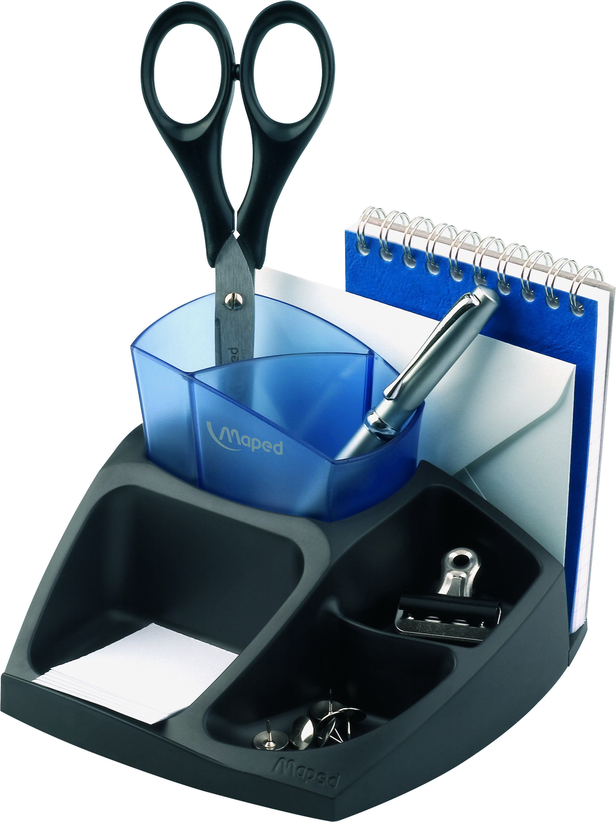 Az optimális tárolás érdekében érdemes beszerezni egy asztali rendezőt is, melyben biztonságban tudhatjuk a színes gemkapcsokat, rajzszegeket és bindercsipeszeket. De akár ollót, tollat és jegyzetfüzetet is tárolhatunk benne.