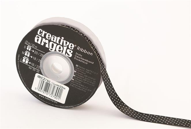 Szatén szalag, 15 mm x 22 m, fekete fehér pöttyökkel
