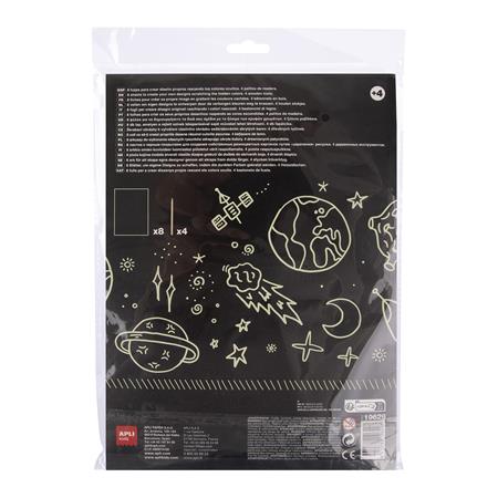 -a készlet 8 képkarcoló lapot (A4) és 4 fapálcikát tartalmaz