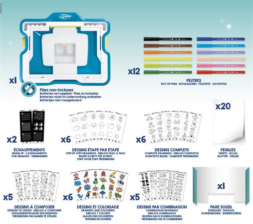 Készlet tartalma: 1 db világító rajztábla 12 db filctoll 2 ív gyakorló lap 6 ív „lépésről lépésre” lap 22 ív komplett rajz 20 ív rajzlap 1 db árnyékoló