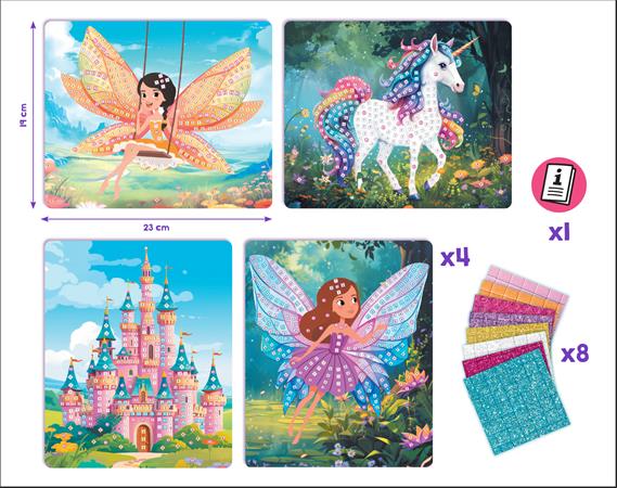 4 varázslatos kártya, amelyet öntapadó mozaikokkal lehet díszíteni. Ragaszd az öntapadó mozaikokat a képekre, hogy életre keltsd azokat. Praktikus készlet, amelyhez nincs szükség ragasztóra! A mozaikok könnyen felragaszthatók és tökéletesen alkalmasak a kis kezek számára.