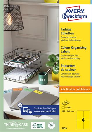 Etikett, 105x148 mm, színes, AVERY ZWECKFORM, sárga, 400 etikett/csomag