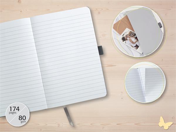 Gyönyörű jegyzetfüzet számos apró, praktikus részlettel.