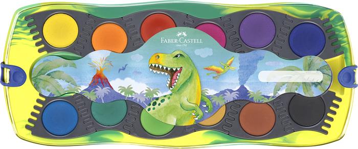 Vízfesték, 12 darabos, összeilleszthető, FABER-CASTELL "Dinoszaurusz"+1 tubus fehér tempera + dinoszaurusz matrica