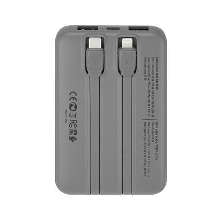 Hordozható, ultragyors töltésű akkumulátor beépített kábelekkel.