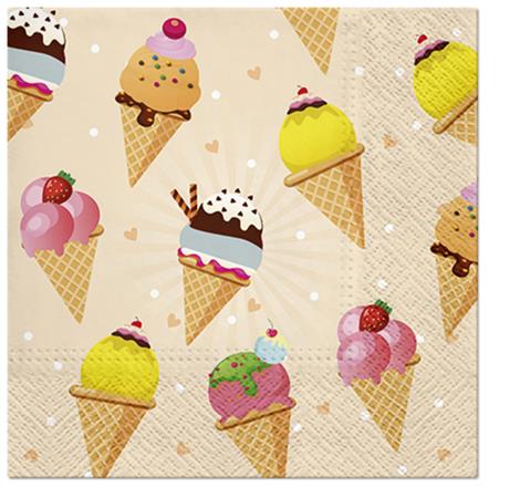 Kerti partikhoz, sütögetős bulikhoz, születésnapokhoz ajánljuk ezt a színes fagyi mintás szalvétát, amelyet kiegészíthetsz hozzá illő tányér és pohár együttesével.