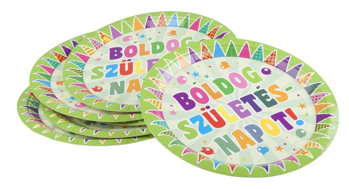 Tányér, papír, 23 cm, "Boldog születésnapot", zászlós
