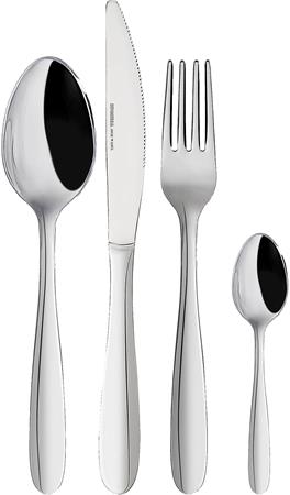 A szett tartalma: 6 db evőkanál, 6 db evővilla, 6 db evőkés, 6 db kávéskanál.