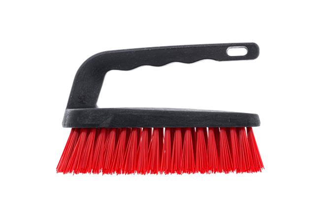 Fogantyús műanyag súroló kefe, műanyag szálakkal, nélkülözhetetlen takarítóeszköz a foltok és szennyeződések eltávolításához.