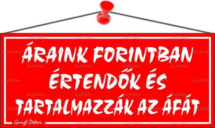 Információs tábla, 22,5x10 cm, "Áraink forintban értendők és tartalmazzák az áfát", piros