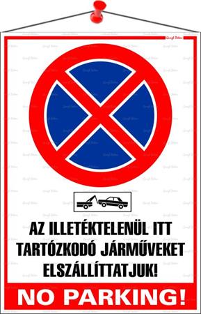 Információs tábla, 35x25 cm, "Az illetéktelenül itt tartózkodó járműveket elszállíttatjuk! No parking!"