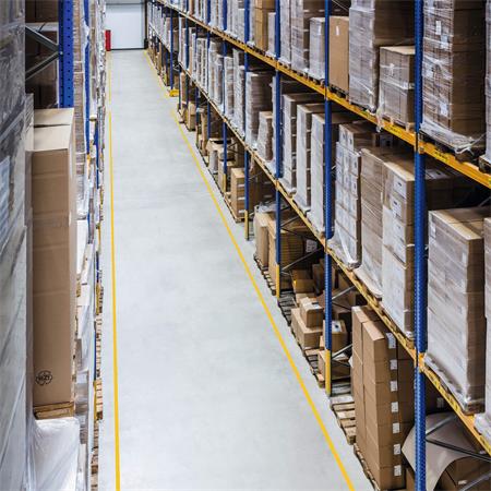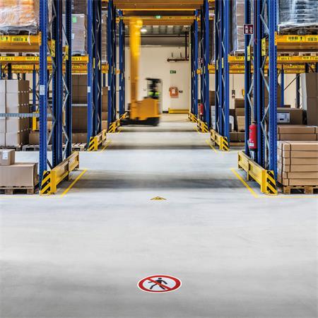Öntapadó padlójelölő szalag a járdák és gyalogos forgalom elől elzárt területek kijelöléséhez gyárakban, raktárakban.