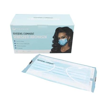Papírmaszk, egyesével csomagolt, háromrétegű, gumis, 50 db, kék